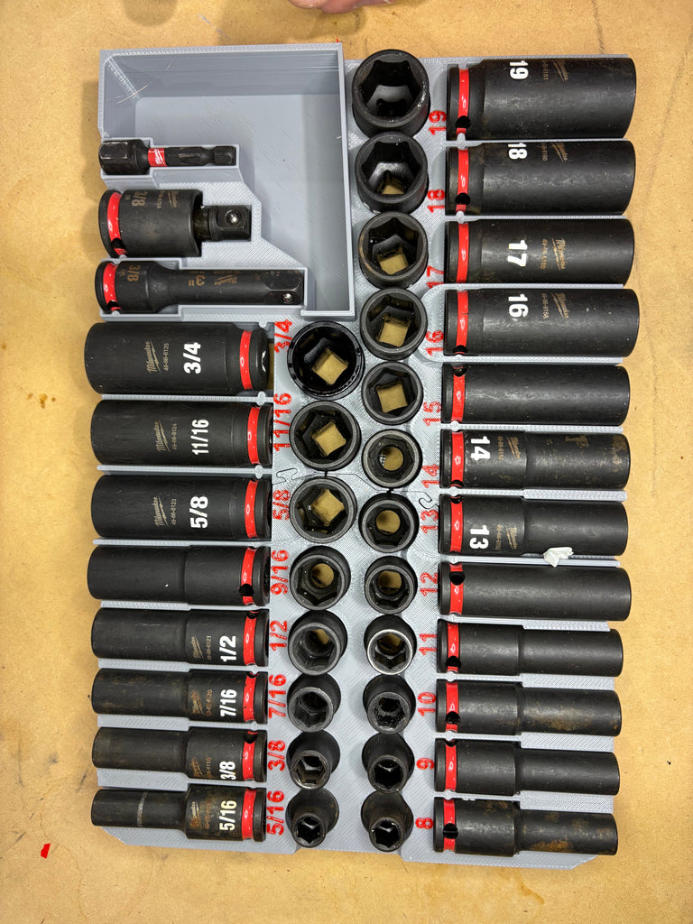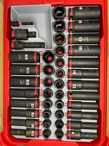 Holds 43-piece 3/8" drive impact socket set 49-66-7009, and has an open tray to hold additional sockets.  Fits any low profile packout.