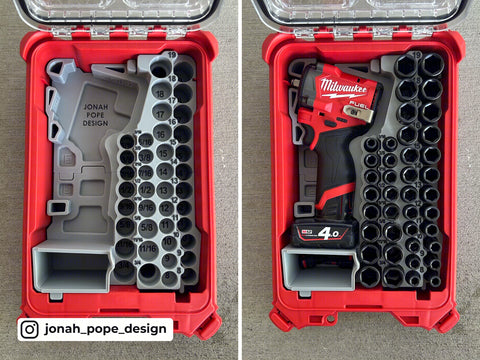 This is a custom insert designed to fit your Milwaukee Packout to store your M12 Stubby Impact (3/8) plus the FULL 43 Piece Milwaukee Shockwave Impact Socket Set . It specifically fits the Milwaukee 48-22-8435 PACKOUT Compact Organizer.